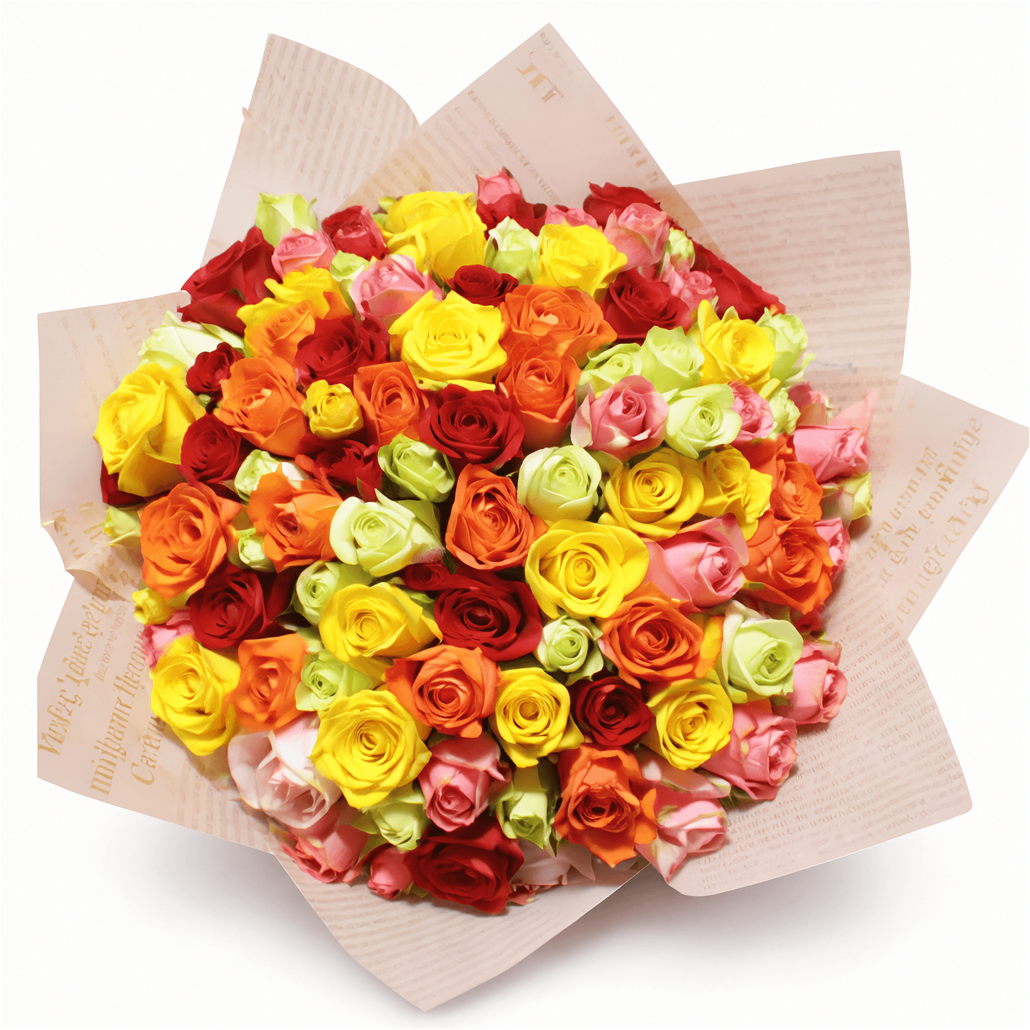 Shop the 100 Mix Roses Bouquet, of rainbow colors of yellow, orange, white, pink, and white. Order mixed rose bouquets for all occasions online