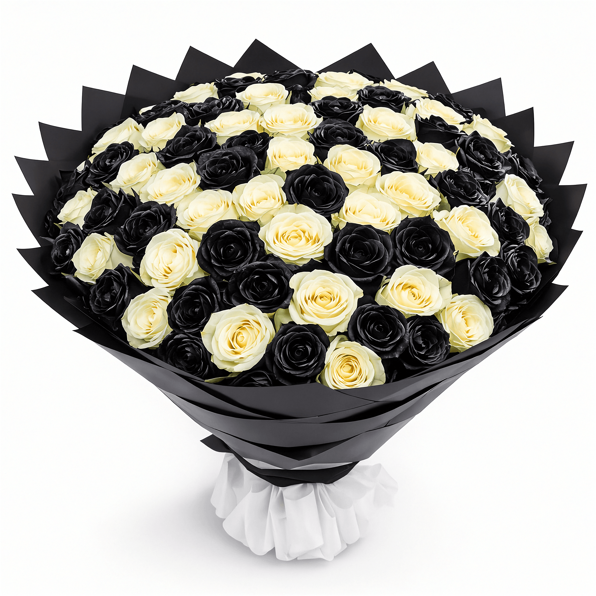 Make a powerful statement with our 50 White & Black Roses Bouquet, a striking arrangement that blends pure white roses with uniquely dyed black roses for a bold, modern, and unforgettable look. This luxury bouquet is designed for those who want to express deep emotions, sophistication, and individuality.