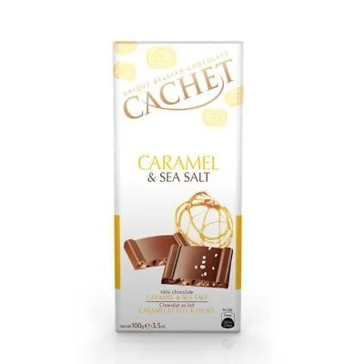 Cachet Caramel & Sea Salt 100g: Indulge in the perfect blend of rich caramel sweetness and savory sea salt in this delightful chocolate treat.