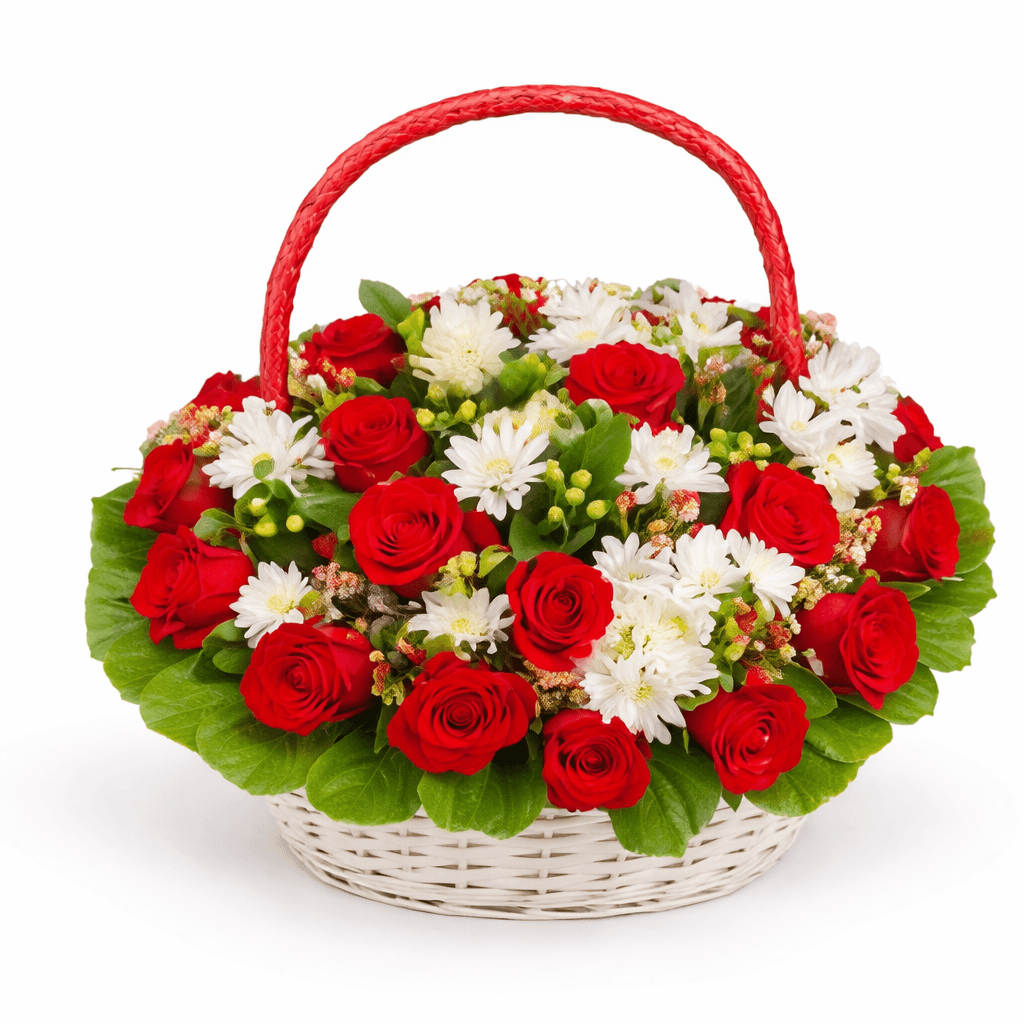Bring a refreshing touch of nature into any space with the Cool Breeze Flower Basket from Nectar Flower Shop Nairobi. This beautifully handcrafted arrangement blends the timeless elegance of fresh red roses, the cheerful charm of chrysanthemums, and the playful pop of decorative berries, all arranged in a stylish basket with lush greenery.