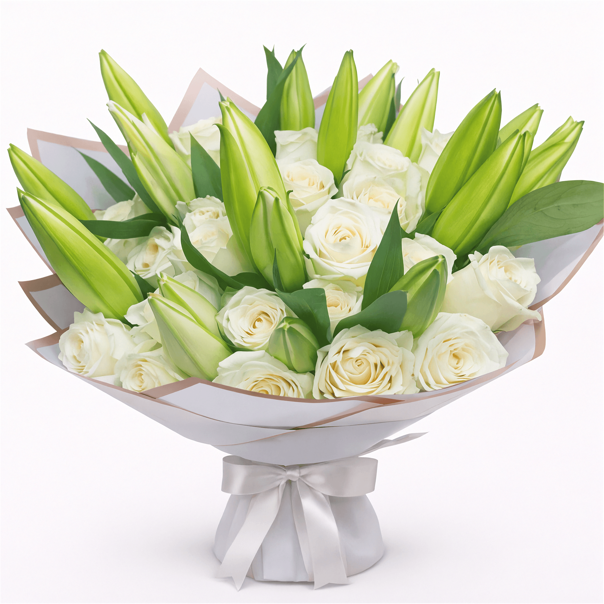 - Premium white roses and fresh lilies