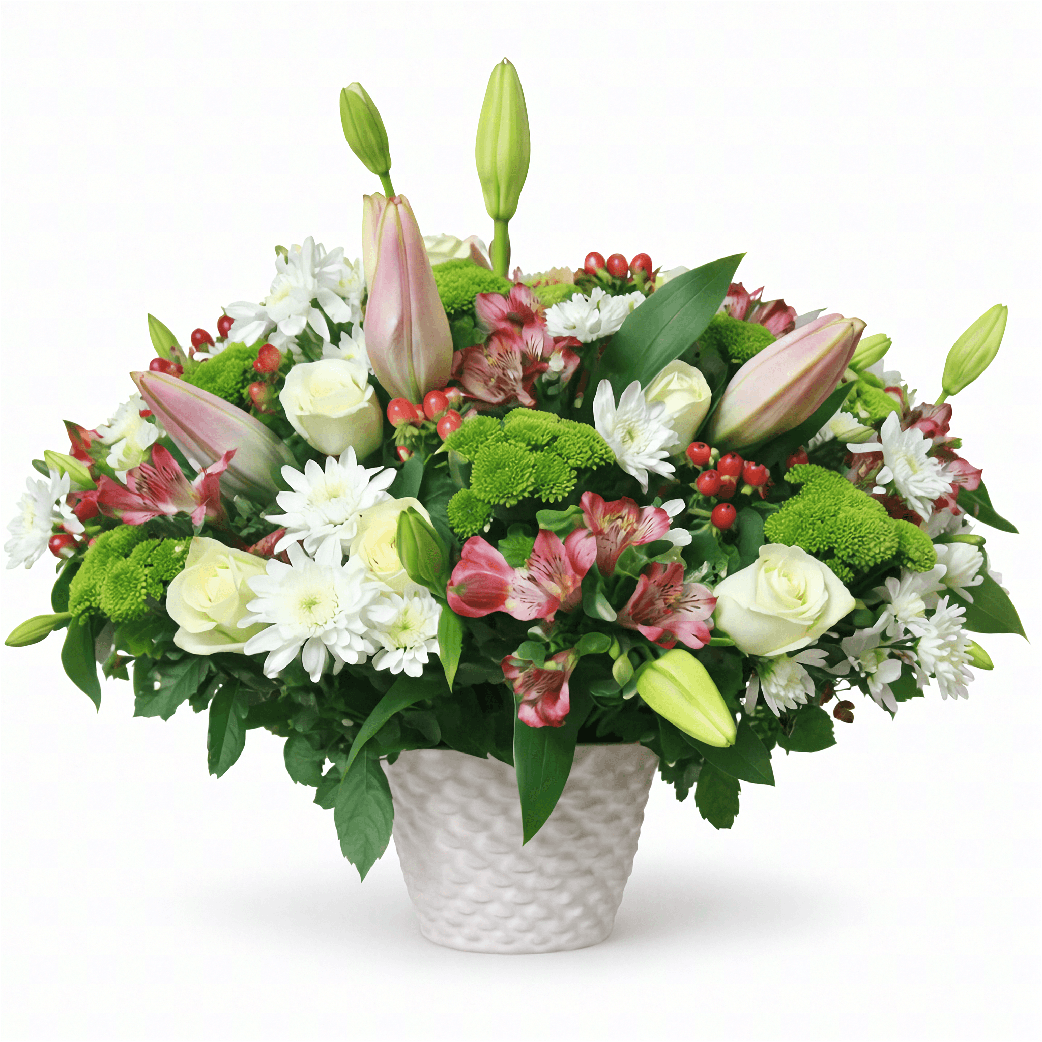 Make someone feel truly special with the One In A Million Flower Vase Arrangement, a premium floral gift designed to express love, admiration, and deep appreciation. This luxurious bouquet features fresh lilies, white and green chrysanthemums, delicate alstroemeria, elegant white roses, and vibrant red berries — beautifully arranged in a stylish vase for maximum impact.