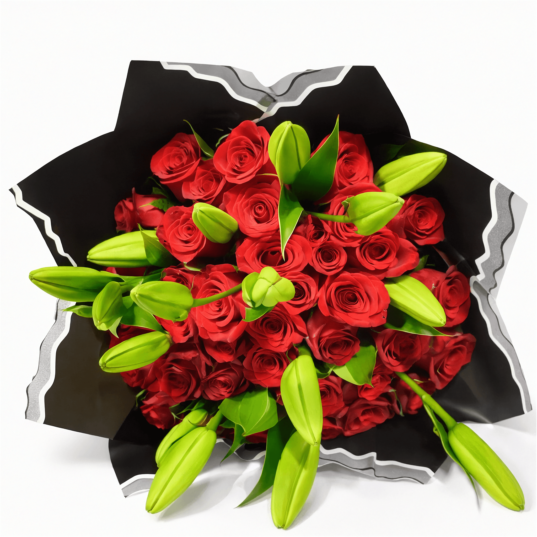 The rich red roses symbolize love and devotion, while the elegant oriental lilies add a touch of sophistication and a captivating fragrance. Wrapped in sleek black packaging for a modern and stylish presentation, this bouquet is perfect for anyone looking to send premium flowers in Nairobi.