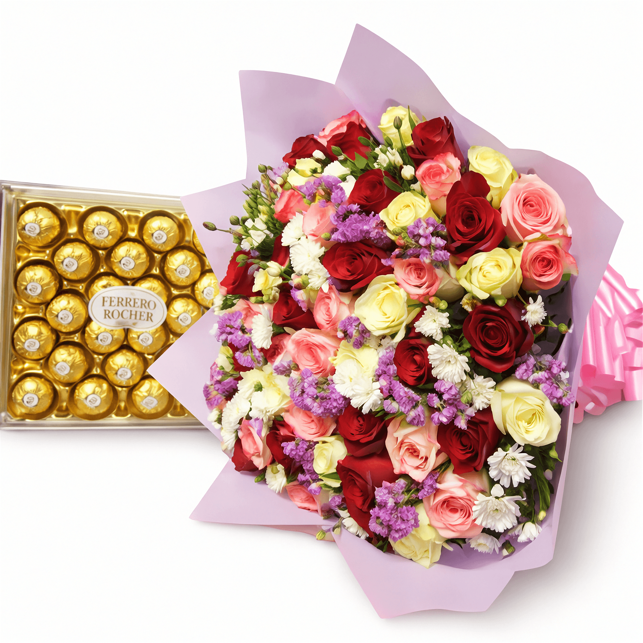 Shop Sweet Heart Bouquet of three dozen pink, white, and red roses with purple and white fillers, and 24 pieces of Ferrero chocolate.